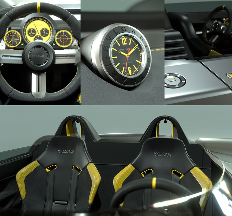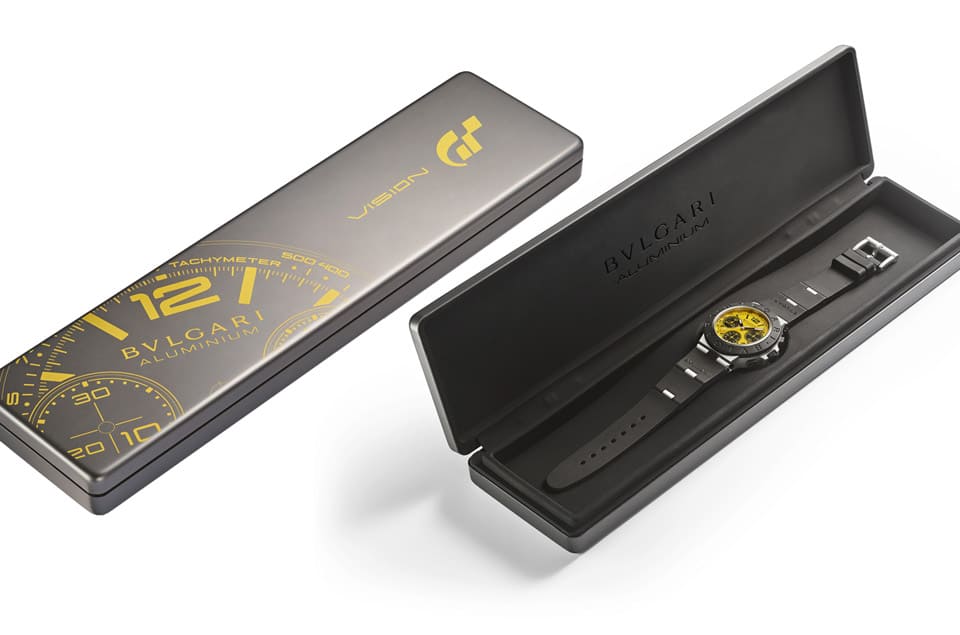 驚喜不只如此,寶格麗還專程為了《跑車浪漫旅》以及Vision GT概念車企畫設計出一款Aluminium Vision GT概念車。車款外觀為磨砂鋁合金材質、車體下半部和零件改採碳材質,並以黑色橡膠包覆以保護車體零件。而在車室部分,寶格麗選擇鋁合金、黑色橡膠、碳灰麂皮等材質,包括方向盤、車用時鐘、以及椅背等處也都有黃色細節點綴;有趣的是,Aluminium Vision GT概念車的儀表板和Aluminium x Gran Turismo特別版計時碼錶的面盤如出一轍,當真是車錶一體的概念。