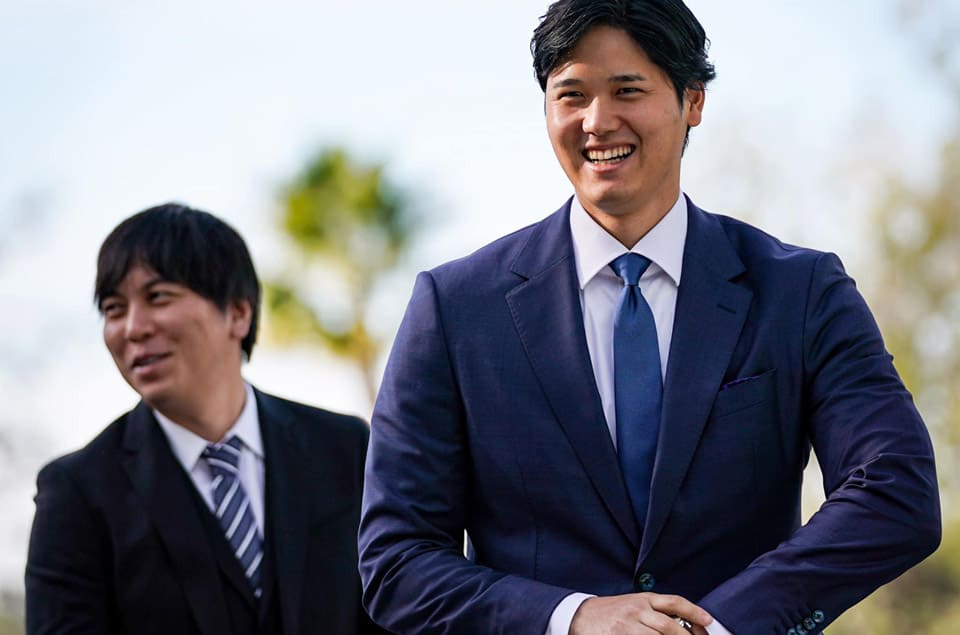 ▲大谷翔平和自己信賴的貼身翻譯水原一平雙雙穿上正式服裝參加道奇隊加盟記者會。Source:Facebook @Los Angeles Dodgers