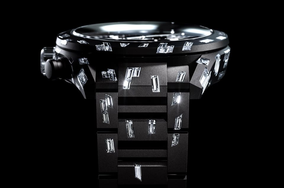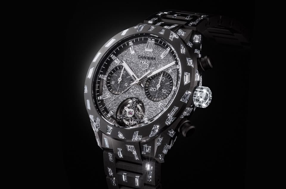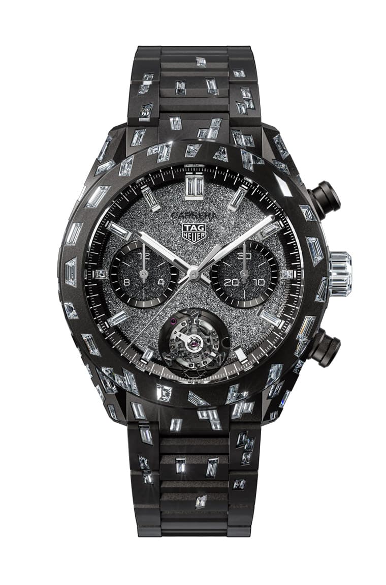 ▲Carrera Plasma前衛鑽石陀飛輪計時碼錶的黑色鋁殼與鍊帶以化學氣相沉積技術鑲上造型富有變化性的實驗室培育鑽石,整只錶發出耀眼光芒。