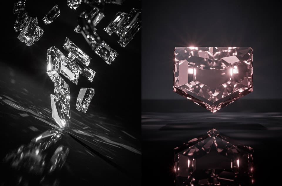▲多晶鑽石面盤能反射出多變晶芒,與面盤上的實驗室培育鑽石時標以及粉色鑽石盾型標誌相映生輝。
