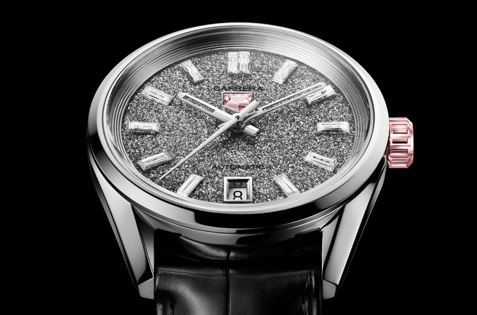 Carrera Plasma前衛粉鑽手錶的面盤也是以多晶鑽石製成,面盤邊緣的白金時標基座共鑲有12顆實驗室培育鑽石,多晶鑽石由於不像Carrera Plasma前衛鑽石陀飛輪計時碼錶有小錶盤、陀飛輪裝置等,因此更能完整展現其不規則造型反射出的萬丈光芒。泰格豪雅特別改用粉色鑽石切割成品牌的盾型標誌,並鑲在面盤12點位置,其在多晶鑽石面盤上格外醒目,與白金錶殼的光芒互相輝映,讓人看得如癡如醉。
