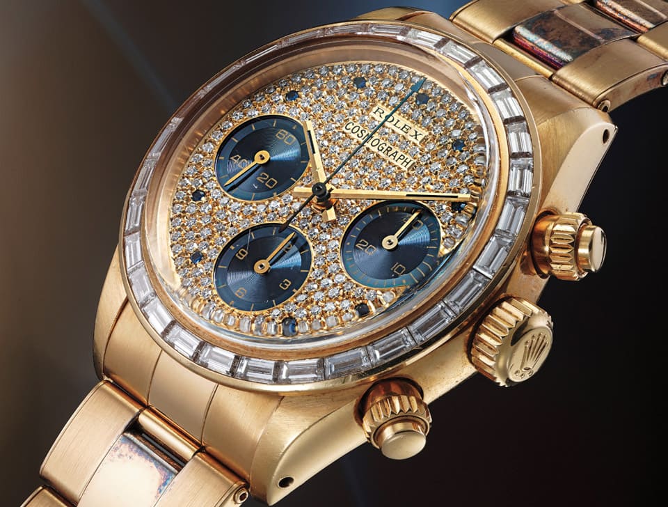 與前面兩款百達翡麗2499萬年曆計時碼錶出自同一場拍賣會,年度第4名就是在當時硬生生超過那兩只PP的勞力士Daytona 6270。錶款採用黃金材質,並在錶圈鑲上矩形切割鑽石,面盤也全部鑲上鑽石另外搭配藍寶石時標。由於這款Daytona 6270 “The End Game”目前已知僅有8只,所以收藏家們當時卯足全力在競標這款錶,最終手錶以410萬美金的數字落槌,沒有意外地打破Daytona 6270此型號的拍賣身價紀錄。