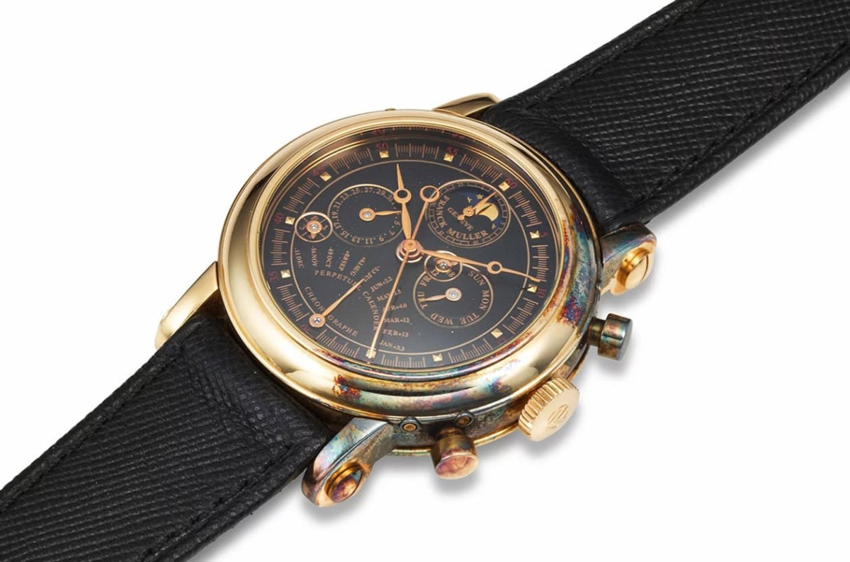 一講到FRANCK MULLER,通常會想到酒桶形錶殼、大膽的配色以及不按牌理出牌的創意設計。這款7000 QP E的特色在於它完全不像印象中的FRANCK MULLER手錶,它反而走的是傳統複雜功能手錶路線。錶款面盤可見密密麻麻的萬年曆、月相和計時碼錶等各項功能資訊,K金錶殼搭配黑色面盤讓這款錶看起來高雅又古典。不過「強叔」以前應該滿愛戴這款錶的,因為按把和錶耳周圍可見有部分已經嚴重變色,實在不清楚艾爾頓強當初怎麼把錶戴成這種狀況的,還好這對手錶的性能沒什麼影響,如果不介意外觀完整度的收藏家應該還是會有興趣。