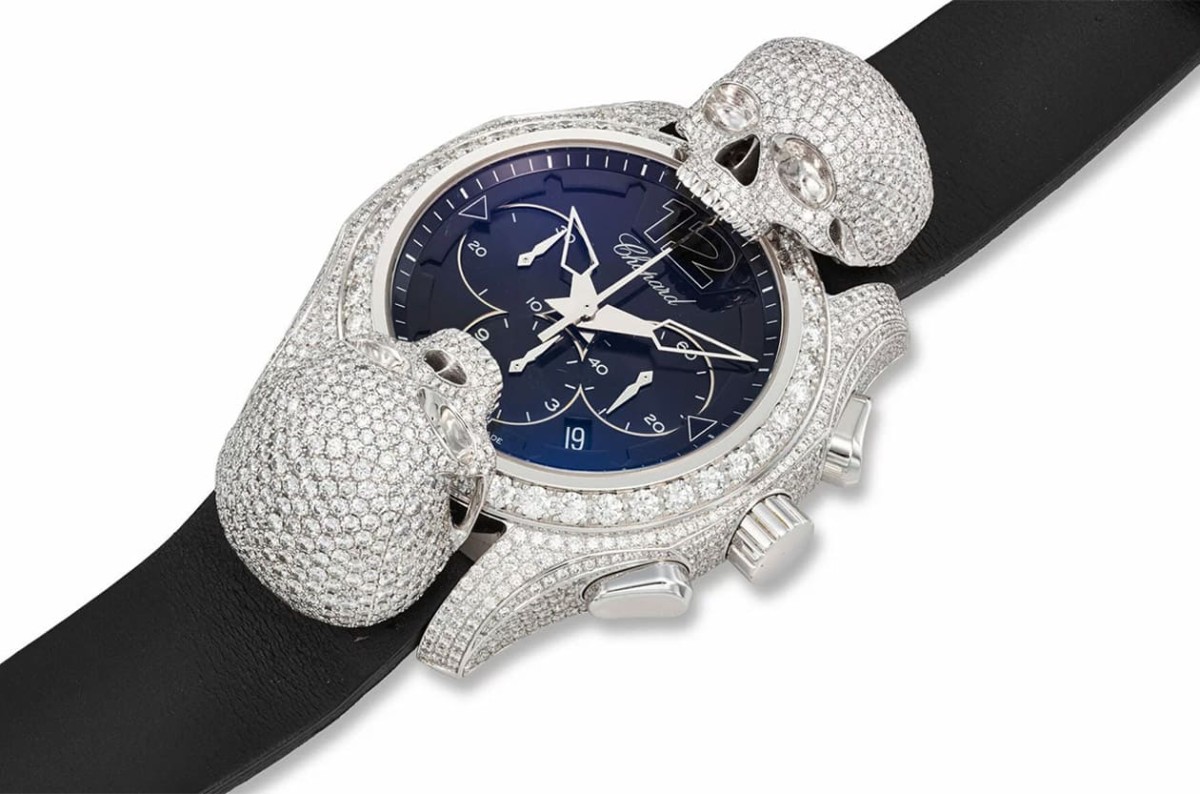 蕭邦為艾爾頓強的愛滋病基金會設計了這款外型很有張力的手錶,品牌用哥德式的風格在錶殼外加上兩顆與錶殼同樣鑲滿鑽的骷髏頭,用意是想要提醒世人注意愛滋病的防治與治療。因此手錶本質其實就是一款蕭邦的計時碼錶,但是在錶殼加上醒目的立體裝飾造型以及華麗的鑽石元素後,整只錶變得超級搶眼。而經過不少像艾爾頓強這樣的名人疾呼全球對愛滋病的重視後,目前這種疾病的致死率已經相對降低許多,但這款錶仍時刻提醒我們不能輕忽這種疾病帶來的威脅。