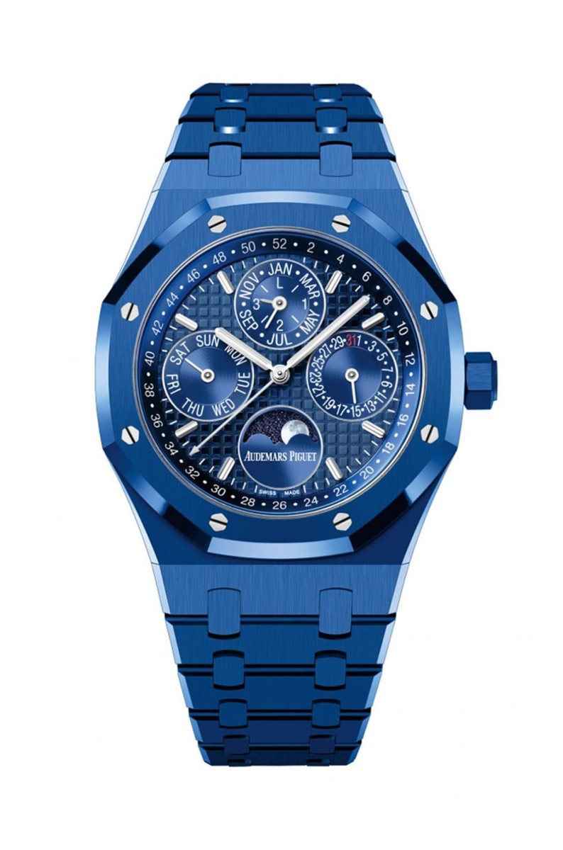 愛彼AP在2022年慶祝皇家橡樹系列50週年時出人意料地發表了這款採用藍色陶瓷錶殼的皇家橡樹萬年曆,這是系列中同功能作品中繼黑色與白色陶瓷後,第三種陶瓷錶殼顏色,然而藍色陶瓷的視覺效果比起前兩種顏色都要更強烈,也因此一躍成為皇家橡樹萬年曆最受歡迎的陶瓷錶款款式。愛彼AP使用高硬度的陶瓷材質詮釋皇家橡樹的經典造型,且就算陶瓷相當堅硬,品牌還是有辦法在錶殼和鍊帶表面作出拉絲和拋光等多重修飾,賦予藍陶瓷層次更豐富的視覺感受。這款萬年曆和其他同功能作品相較有個特色在於面盤外緣有顯示一年52個星期的週數刻度,並搭配中央指針,讓時間顯示更顯層次。另外6點方向的月相顯示也很值得賞玩,因為這裡的月亮採用了高精細印刷的寫實版本,搭配砂金石圓盤更有那種實際觀看星空的擬真效果。藍色陶瓷的皇家橡樹萬年曆上市後很快被不少國際名人納為收藏,目前在Chrono24等二手錶平台上展示的價格動輒超過1,700萬台幣,堪稱是藍色陶瓷手錶裡的聖杯型作品。
