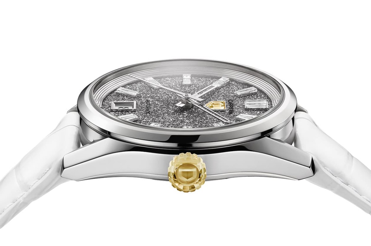 除了錶冠之外,手錶面盤12點方向也鑲有另一顆實驗室培育黃鑽製成的立體盾形標誌,而整枚面盤則是一種多晶體鑽石,它有點像是在單顆鑽石表面上形成猶如雪花鑲嵌般的效果,可以多方反射光線,發出令人目眩神迷的光芒。面盤外圍還鑲有12顆總重約0.5克拉的長方梯形切割實驗室培育鑽石,其中12點向一次鑲了兩顆,因為6點方向設有日期窗故沒有另外鑲鑽,所以整體算下來時標還是鑲了十二顆實驗室培育鑽石。