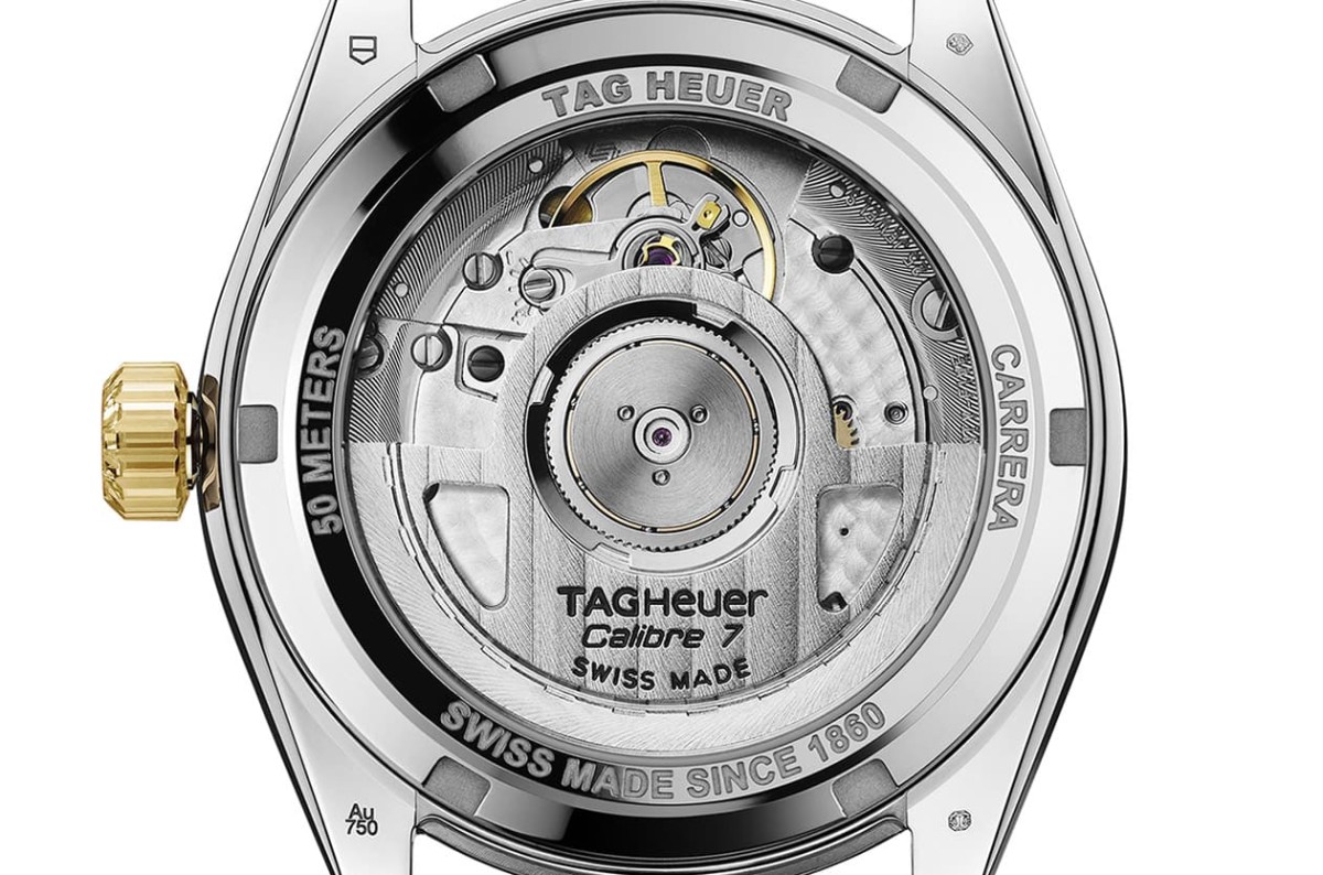 ▲Carrera Plasma前衛黃鑽手錶搭載的Calibre 7機芯於錶背能夠一覽無遺,其動力儲存可達56小時。