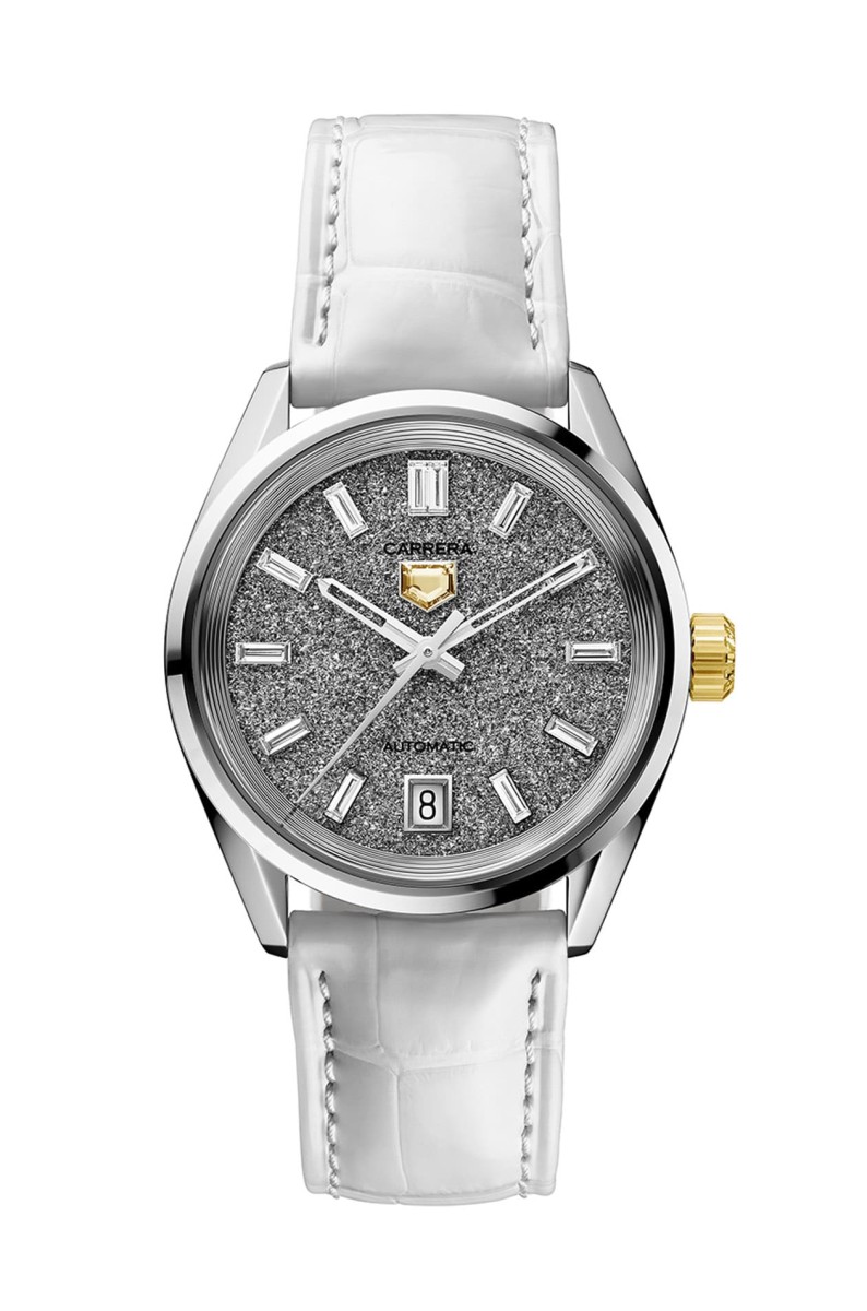 Carrera Plasma前衛黃鑽手錶內外規格大致上都和去年的粉紅鑽款一致,包括錶徑為36mm、搭載Calibre 7機芯具備大三針加日期功能,同時手錶的錶殼也是以白金製成,其造型、面盤格局和Carrera Plasma前衛粉鑽手錶猶如同一個模子刻出來的一樣,不過泰格豪雅替新作配置了白色鱷魚皮錶帶有別於前作的黑色鱷魚皮錶帶,另外在局部鑽石顏色上也能明顯看出兩款錶的獨特個性。