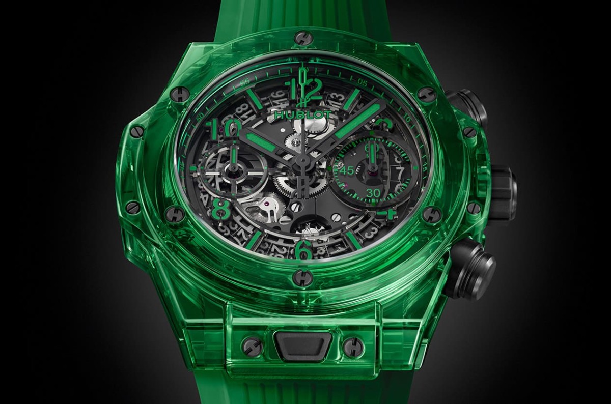 HUBLOT宇舶旗下開創出許多彩色透明錶殼作品,然而它們不盡然都是成分中添加過金屬氧化物的藍寶石水晶,像是品牌曾應用至MP-11、Spirit of Big Bang計時碼錶抑或Big Bang陀飛輪的"SAXEM"材質,就屬於類藍寶石,但又並非狹義的藍寶石材質。2024年宇舶持續以綠色的SAXEM材質創作Big Bang Unico計時碼錶,將高科技材質與自家招牌的系列作品相結合,激盪出非常迷人的新火花。