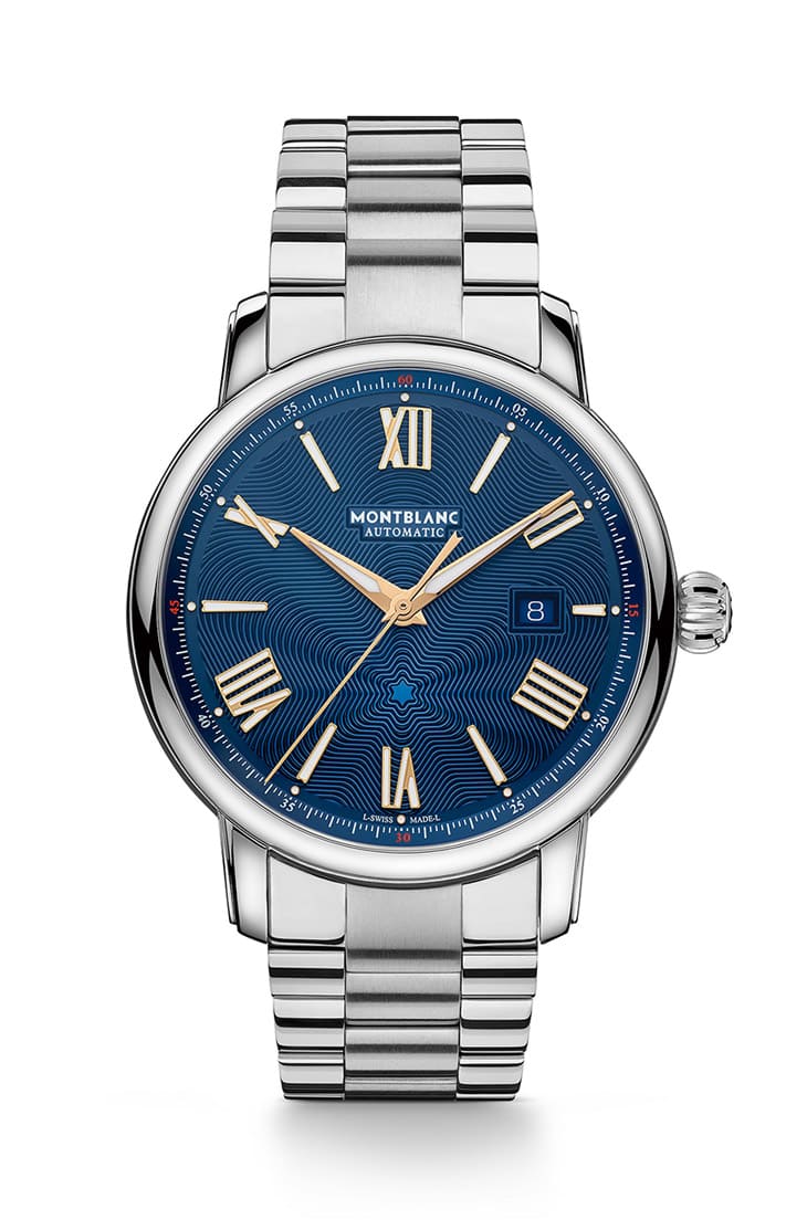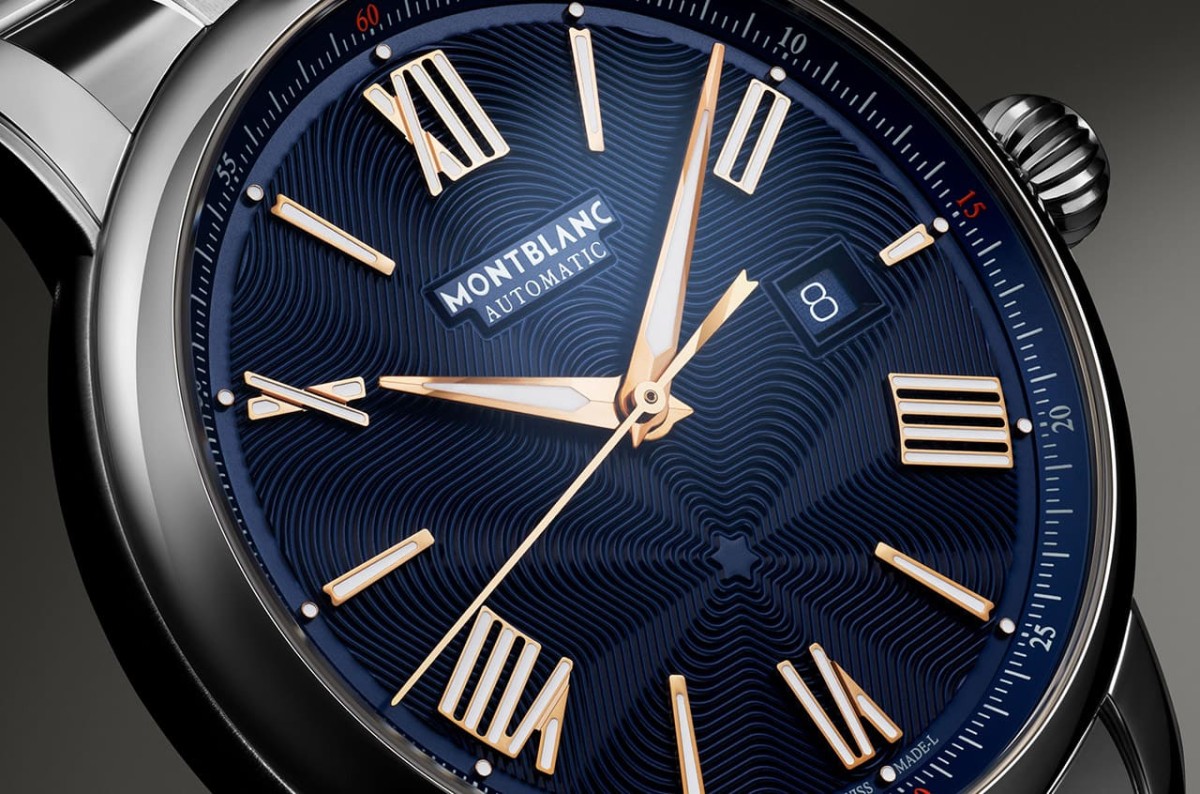 明星傳承系列日期顯示自動錶限量款800的面盤格局為簡約大三針,3點方向設有日期顯示,面盤獨樹一幟的六角星扭索紋鍍上藍色,象徵著白朗峰當地的嚴寒氣候,品牌特別將時標與指針鍍上玫瑰金色,在藍色背景的襯托下散發高雅個性。面盤外圍的分鐘刻度分別設有以5分鐘間隔的小型夜光圓點與以15分鐘間隔的橘色圓點標示,其與指針和時標上的夜光塗層都有提升辨時清晰度的效果,另外日期視窗底下的轉盤為藍底搭配白色數字,看起來同樣一目瞭然。錶款搭載MB 24.17自動機芯,擺輪震頻為28,800vph,動力儲存38小時則是中規中矩。