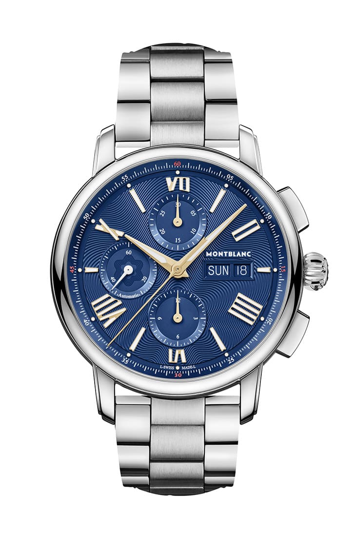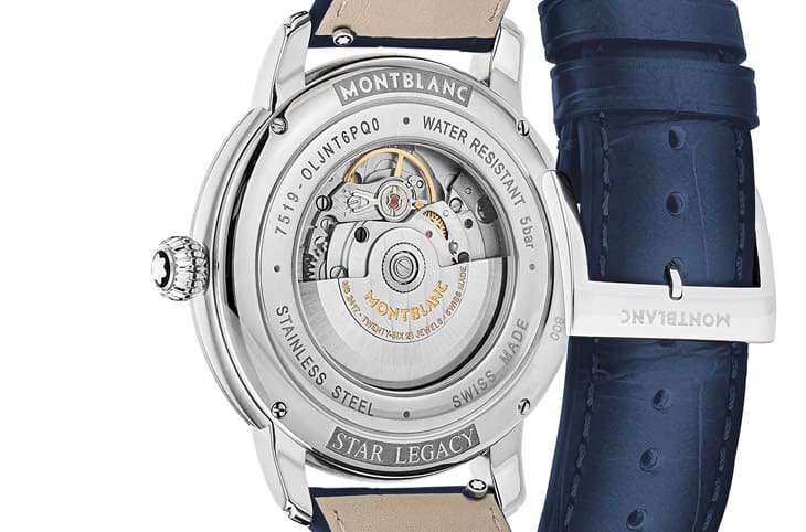 例如萬寶龍以不鏽鋼製作兩款錶的錶殼,其錶徑皆為大器豪邁的43mm,另外錶殼外觀也都經過拋光修飾、錶背也同樣有透明底蓋可以欣賞機芯結構,再者萬寶龍亦各別替兩款錶配置不鏽鋼鍊帶或藍色鱷魚皮錶帶供市場挑選。兩款錶還有一個不可不提的亮點,就是它們的面盤顏色與花紋也都保持著鮮明的共通性,從中也透露出手錶與初代萬寶龍標誌跨越時空的緣分。