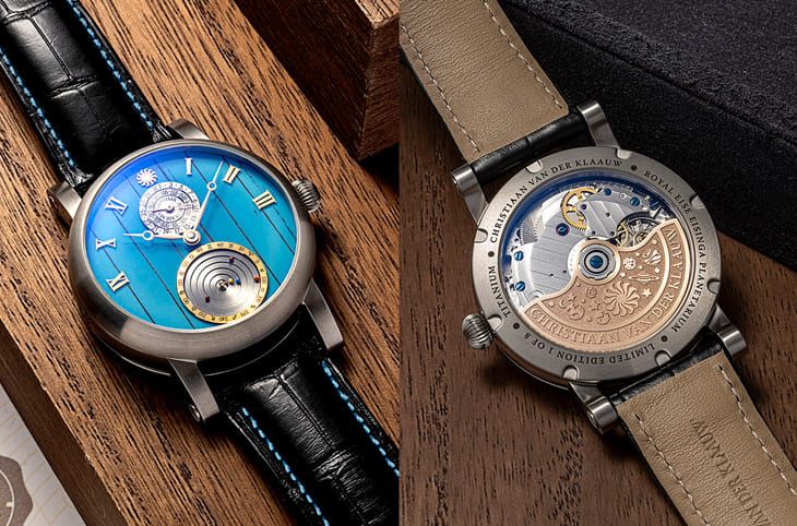 首先看到CHRISTIAAN VAN DER KLAAUW替SHH台北101頂級鐘錶概念店創作的Planetarium Eise Eisinga星象儀手錶,錶款面盤重現荷蘭弗拉訥克Eise Eisinga天文館的天花板場景,其具有皇家藍色調人造木板和木紋,而以鈦金屬製作的錶殼裡則蘊涵世上最迷你的機械星象儀,在面盤6點方向可見圍繞太陽運行的水星、金星、地球、火星、木星和土星運行軌道與動態。手錶搭配黑色鱷魚皮錶帶搭配藍色縫線,面盤的時標與指針則鍍上玫瑰金烘托手錶稀有高貴的賞玩意義。