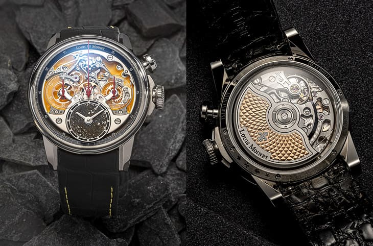 LOUIS MOINET則是專程製作一款Memoris Meteorite SHH版,品牌首度改用一顆名為"Legend of Punggur"的隕石製作手錶的偏心小錶盤,替這款品牌的代表作帶來換然一新的樣貌。錶款以鈦金屬製作,面盤可見精緻的隕石小錶盤,此外手錶的計時功能組件也以開面設計顯露於佩戴者眼前,其中蘊含紅色計時大秒針與計時分針,還有小秒盤,雙眼小錶盤設有半透明的刻度環,機芯中層的琥珀色面盤得以清楚呈現。手錶的計時功能由一枚按把獨立完成,包括啟動、停止與歸零都是按壓同一枚按把即可完成。錶背可見機芯自動盤擁有講究的機刻雕花,其共由311枚零件組成,每枚零件都以手工製作、打磨,LOUIS MOINET的工藝水準由零件細節可見一斑,品牌鑽研傳統複雜工藝的職人匠心也顯露無遺。