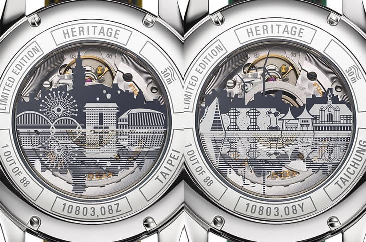 Heritage BiCompax Annual「城市版」的面盤比起一般版更為大膽奔放,例如台北款的面盤為漸層金黃色、台中款的面盤則是漸層綠色,兩款城市版背面的透明底蓋都還有隱藏版亮點,兩座城市的著名地標紛紛出現於此,例如台北款可見台北101、美麗華摩天輪以及圓山大飯店等城市風景,而台中款則有台中國家歌劇院、路思義教堂與高美風車大道等景點,讓人一見到這些圖案很快就能認出專屬於特定城市的特色,加上底蓋周圍也刻有腕錶限量編號與城市名稱等資訊,種種精心設計的細節,讓腕錶與在地收藏家很容易就能產生強烈的共鳴與連結。