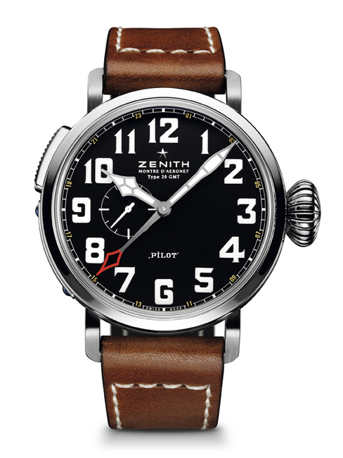 新款飛行員「Type 20飛行器」手錶是真力時早期飛行員系列的尊貴代言人。直徑寬達48毫米,手錶包含了所有的視覺特效:碩大的洋蔥頭鎖入式錶冠,大號阿拉伯數字時標覆有白色超級夜光塗料。寬闊的黑色啞光錶盤清晰襯托出緞光黑色釕金屬超級夜光塗料指針。底蓋的圖案為一枚鐫刻有布萊里奧飛機的紀念章以及「Montre d'AÈronef Type20– ZENITH Flying Instruments」(Type20飛行器手錶–真力時飛行儀器)字樣。錶殼側面可見瑞士民用航空注冊碼「HB」字樣以及手錶序號。