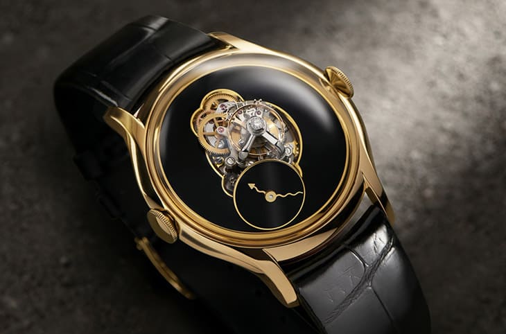 18K黃金材質/自動上鍊機芯/偏心時、偏心分顯示/陀飛輪裝置/縞瑪瑙面盤/藍寶石水晶鏡面、透明底蓋/防水30米/錶徑38.5mm/參考價:NT$ 4,700,000