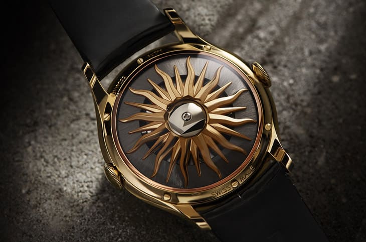 ▲透明底蓋下露出大型太陽形狀自動盤,其立體有機造型在轉動時美不勝收,即使無法窺見機芯組件細部作工依舊引人入勝。