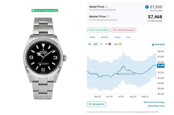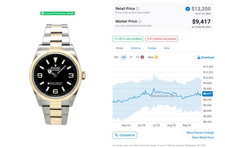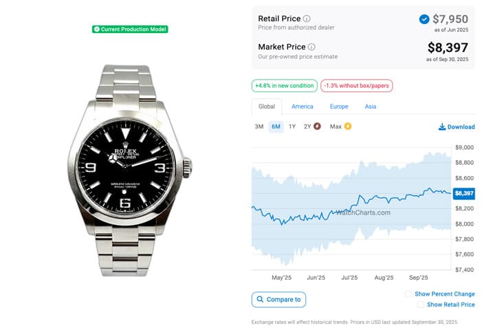 Explorer探一屬於入門型的勞力士運動錶,在各國市場中日本對這款錶的喜愛度甚高(受到日劇天王木村拓哉代表作《戀愛世代》的影響),因此探一在日本二級市場的溢價情況比較明顯,但是如果把同一款錶放到全球範圍,探一的受歡迎程度倒是沒這麼誇張。根據高級手錶市場調查研究機構WatchCharts的資料,此系列近年的身價也是從2022年第2季開始直直落,稍微把時間拉近至2025年4月時,當時36mm的不鏽鋼款124270國外報價為7,222美金(約合台幣22萬)、半金款124273則已經處於定價線之下的9,109美金(約合台幣27萬7),至於40mm的不鏽鋼款224270因為怎麼說錶徑對男性還是更受歡迎,所以行情還是較佳,達到8,208美金(約合台幣25萬),光從只有這款屬於超定價的水準來看,顯然今時今日市場對40mm這樣的尺寸還是更有愛。