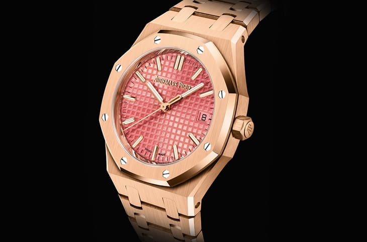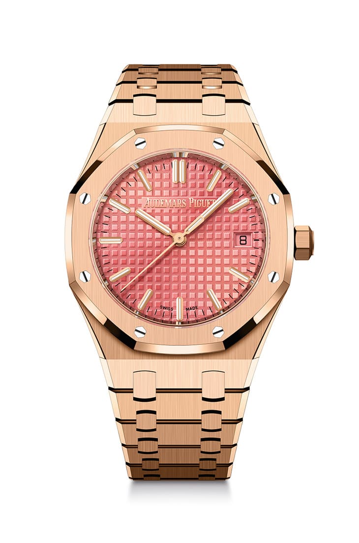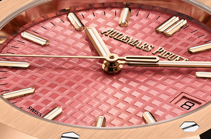 與玫瑰金錶殼呼應的是品牌大膽啟用的ALD(原子層沉積)粉紅色鍍膜Grande Tapisserie大型格紋面盤,面盤上的細節如指針、時標與品牌標誌與錶殼相同都是玫瑰金製成,而且它的指針和時標上也都有白色夜光塗層,保有手錶基本便利的機能性。隨著面盤顏色改為粉紅色,愛彼AP也將日期轉盤上的數字、分鐘刻度與"Swiss Made"字樣改成黑色,如此會因為顏色的對比感幫助佩戴者更能明確辨識時間。