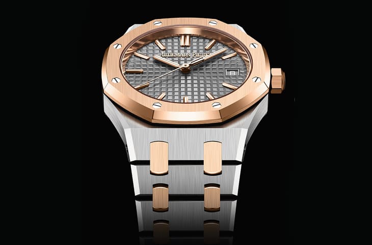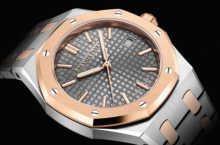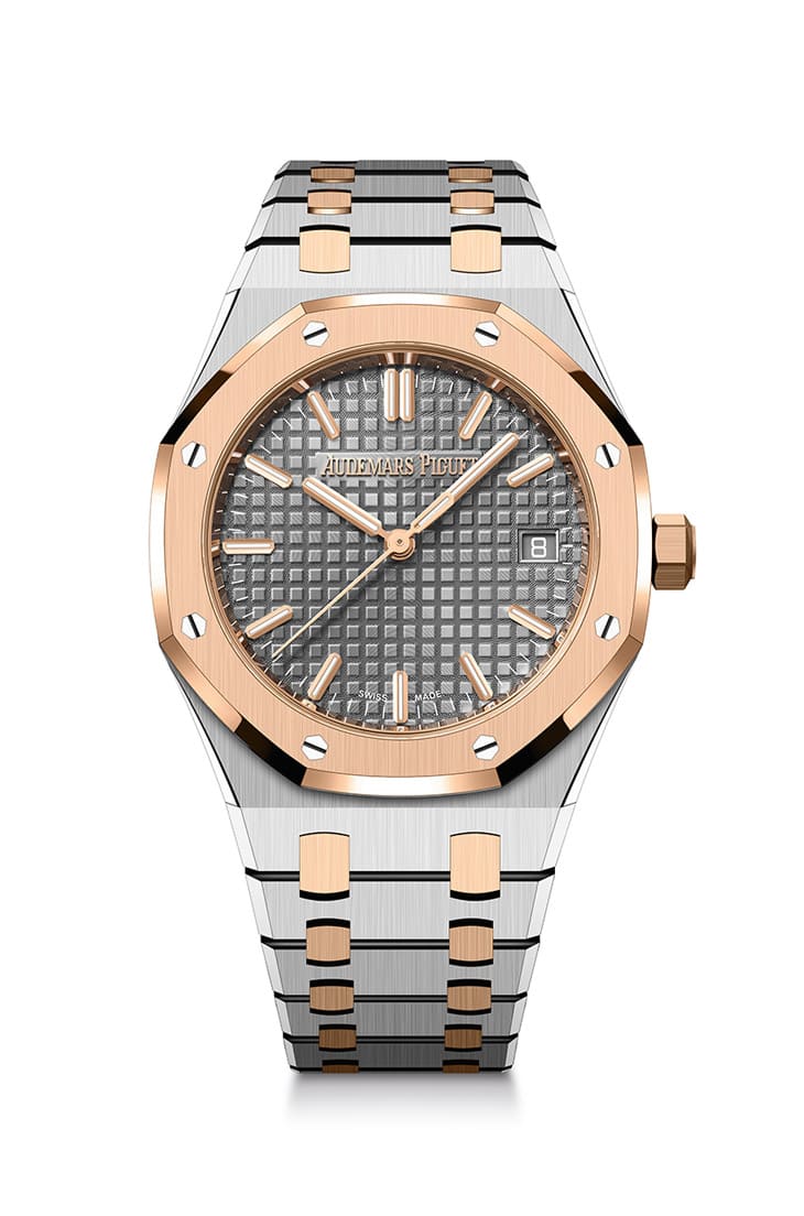 愛彼AP繼先前推出過結合不鏽鋼與18K玫瑰金,並搭配銀色面盤的雙色款後,2024年再接再厲以這兩種材質為基礎創作新款,其錶側、底蓋邊緣以及主要鍊帶鍊節都是用不鏽鋼製成,而錶圈、錶冠,以及連接鍊節的零件則是玫瑰金材質,雖然手錶外觀用上兩種金屬,但是品牌依舊按照同樣的製作工序在手錶外部零件施加霧面打磨與倒角拋光處理,使得金屬光澤富有層次。