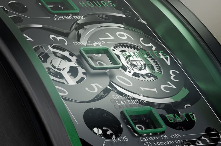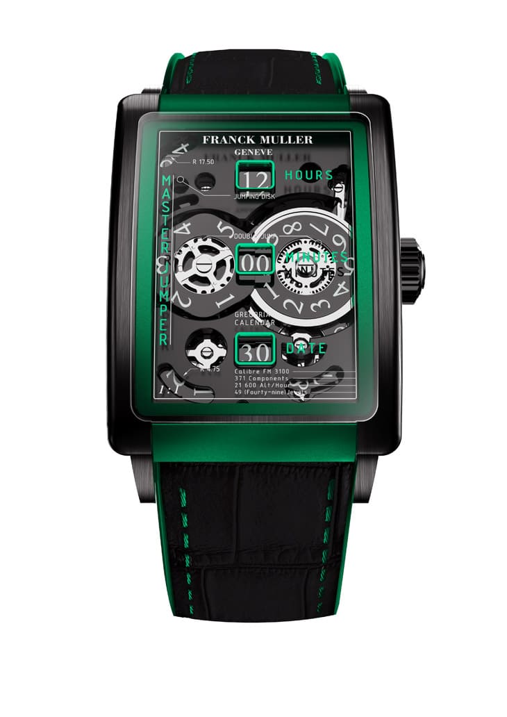 品牌於手錶的鏡面印上看起來帶有科技感的文字資訊以及瞬跳視窗外框,如此一來佩戴者放眼所及除了可以看到鏤空設計的機芯組件,當瞬跳轉盤展示最新的時刻時,透過這些綠色窗框也能快速吸引人注意其中含藏的資訊(FRANCK MULLER還很貼心地在每個窗框右側加上時、分、日期的英文字樣讓人一目瞭然)。Long Island Evolution Master Jumper的瞬跳系統由內部的FM 3100手上鍊機芯推動,其中分鐘和日期視窗以兩枚獨立跳動的轉盤顯示十位數及個位數,而小時視窗則以單一轉盤來顯示。瞬跳機制雖然看時間很方便,不過它難以像指針般普及的主要原因在於要進行瞬跳往往需要更大量的動能,品牌為了要提供三種瞬跳系統足夠的動力,因此在機芯中乃是設置了兩枚發條盒,其中一枚用於供應小時盤與分鐘盤運作動能,另一枚則是推動機芯的正常運作以及日期轉盤,兩枚發條盒就分別位在面盤的12點與6點方向上下對應。要注意的是手錶雖有兩枚發條盒,可是機芯的動能僅為30小時,每日養成上鍊的習慣還是必需的。
