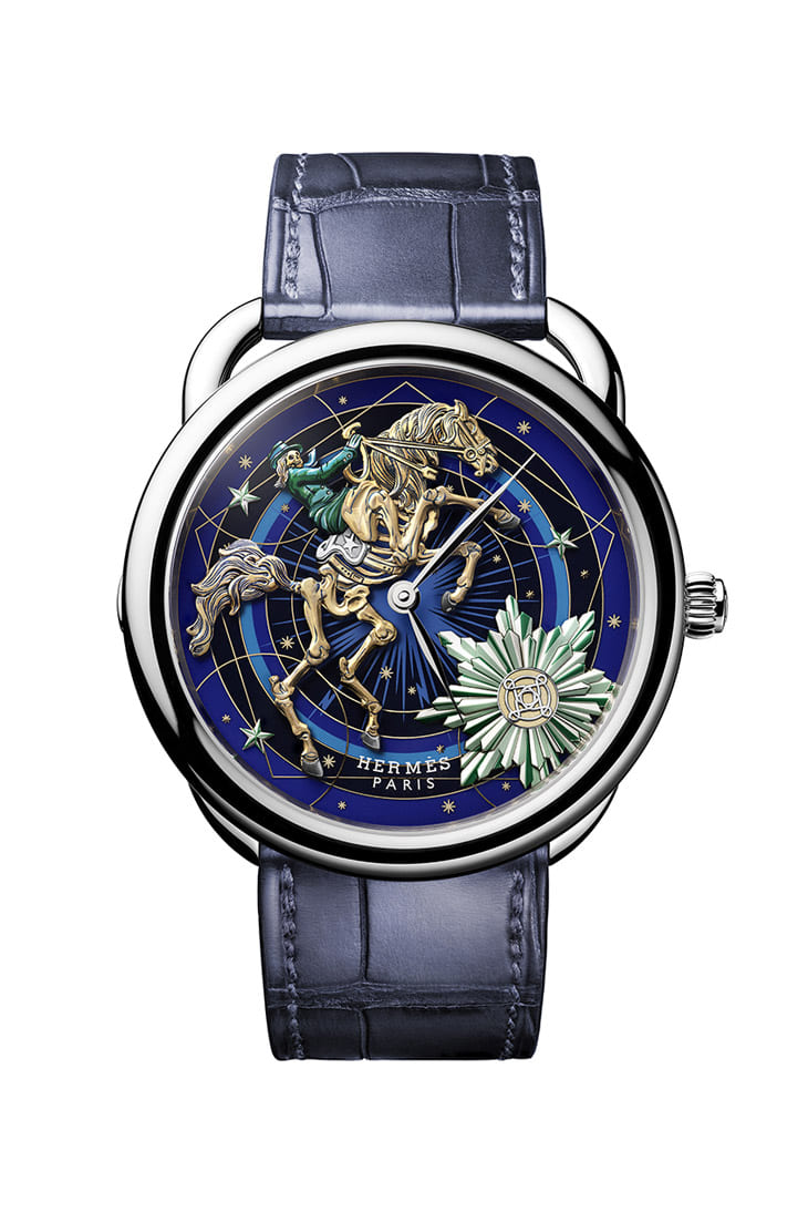 品牌一方面以Arceau系列為基礎,同時再將野村大輔 (Daiske Nomura)設計的Chorus Stellarum絲巾圖案融入作為面盤主題。畫面中騎著戰馬的骷髏騎士,以手工鐫刻和彩繪的活動金質貼花呈現。這個哥德風角色由連結的發條機構驅動,透過9點鐘按把可以進行「一按即動」的操作,它就會流暢地搖擺動起來。面盤周圍使用填漆工藝修飾,勾勒金色線條的星座圖,此象徵嶄新黃道十二宮的圖像巧妙地借鑒了É mile Hermès的收藏,將馬術天際以繽紛漆繪展現在目眩神馳的面盤背景上,透過鍍銠的立體星辰增強效果。愛馬仕另外也還創作出一款在白金錶殼的錶圈鑲嵌70顆鑽石的版本,面盤改成骷髏女騎士,風格與未鑲鑽版本展現出同中求異的視覺效果。