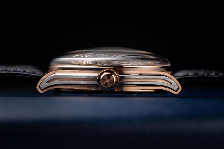 玫瑰金、鈦金屬材質/CYR518-E手動上鍊機芯/跳時、分/雙陀飛輪裝置/錶背動力儲存顯示/藍寶石水晶鏡面、透明底蓋/防水50米/錶徑44mm/限量18只/參考價:NT$ 12,705,000
