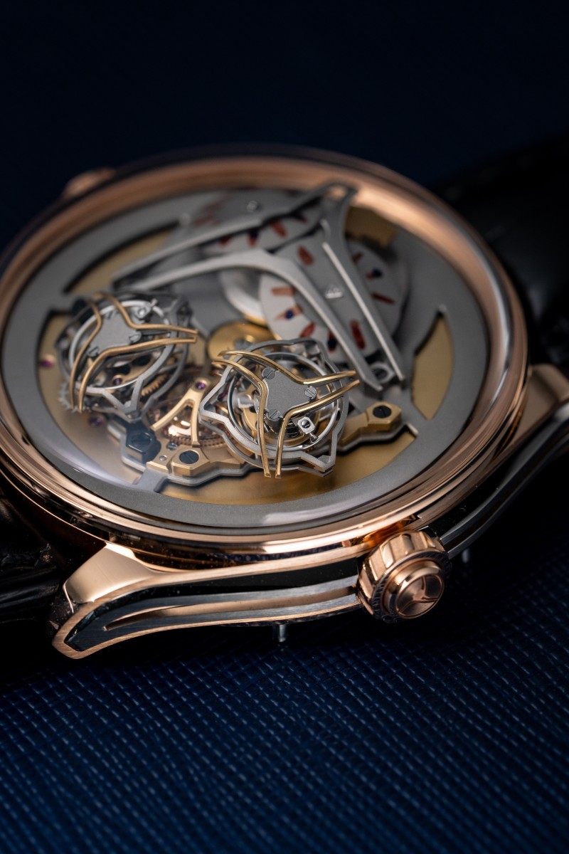 這項於 2018 年啓動的計畫,在經過六年多的努力後終於展現成果。「行星軌道式雙陀飛輪」手錶是 Etheral系列的第一款作品,結合了超現代的外觀設計風格與前衛的機械顯時結構。兩者必須同時發想與製作,才能將極致的製錶工藝與平衡的造型美學合而為一。