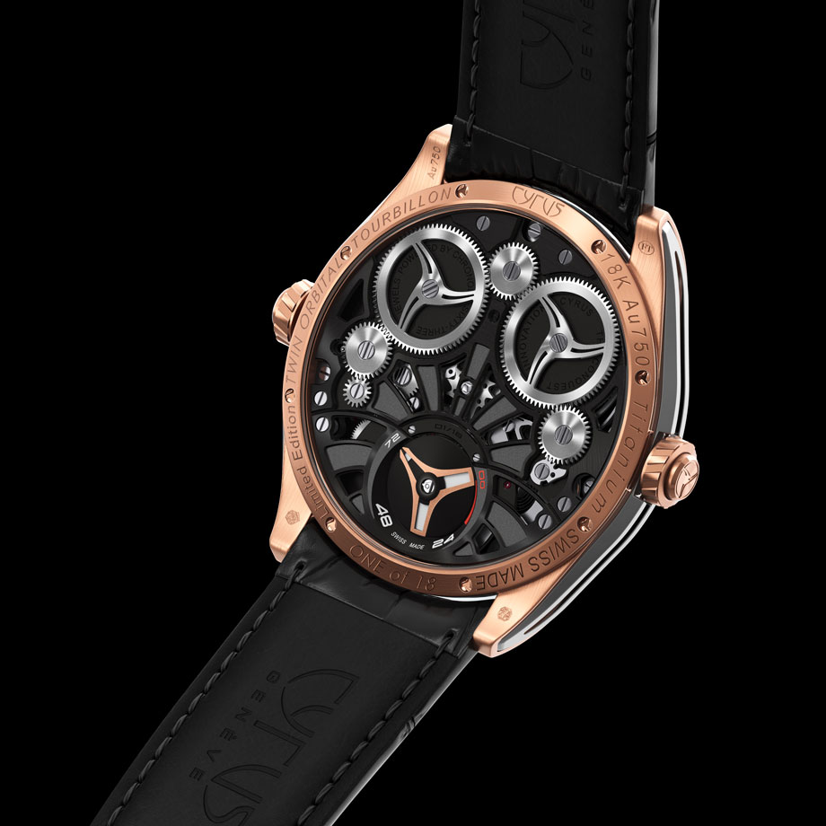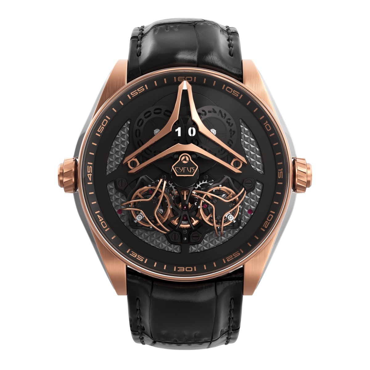 手錶面盤採用黑色、煙灰色和玫瑰金三種對比鮮明的色調,並經過一系列精緻的表面裝飾處理,使每個細節都更加完美,整個構圖看起來非常和諧且平衡。從機芯夾板上的黑色 PVD 塗層、精美倒角的拋光螺絲,到三角形立體機刻圖案,再到陀飛輪上帶有噴砂和倒角處理的CYRUS標誌造型框架,與立體三角造型分針,都與整體設計風格完美契合。