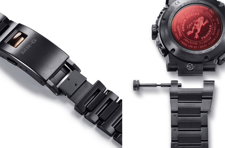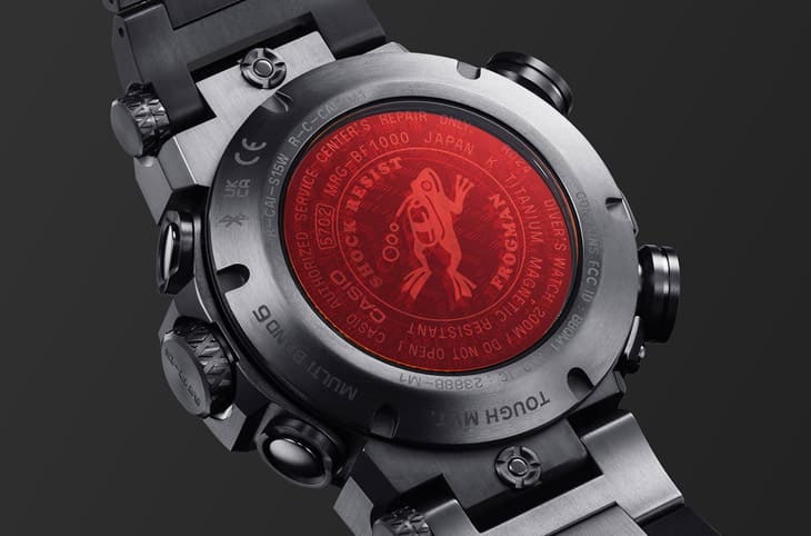 為了吸收來自外在的衝擊力,MRG-BF1000B-1A的錶圈、錶殼、錶冠與按把零件都加入氟橡膠緩衝器,有助於替機芯吸收衝擊力並保護藍寶石水晶鏡面,旋入式底蓋與錶冠設計同樣都出自確保潛水時高密封性的考量。其中錶背底蓋的藍寶石水晶精心採用紅色蒸鍍處理,並且刻印上來自第一代Frogman潛水錶的青蛙圖案,在錶殼與鍊帶背面都是黑色的烘托下,紅色底蓋看起來特別顯眼。