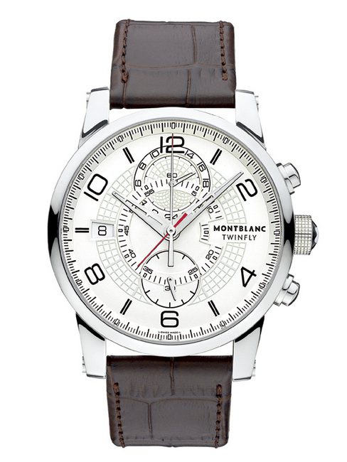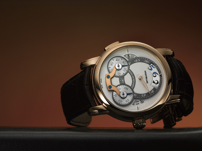 不同於前面介紹的兩款世界時區或是UTC為主的錶款,這款TimeWalker系列雙飛返計時碼錶除了商旅人士最需要的兩地時間顯示之外,更配備了另一日常生活受歡迎的複雜功能——計時碼錶。其所搭載的是2011年萬寶龍的另一枚自製計時機芯MB LL100,機芯採用雙發條盒供應動能,計時機制則是導柱輪機制,可以降低計時作動時,不會因為齒輪切入所造成的不正常抖動,避免計時秒針無法歸零或掉針的情況。這款雙飛返計時碼錶在面盤配置亦頗具特色,計時分針及秒針與時分指針同軸,皆位於中央軸心,60秒小秒盤與60分鐘計分盤皆位於面盤正中央,下方才是30分鐘計分盤,復古了40年前的計時碼錶配置。至於12點鐘位置的空間,萬寶龍則是將24小時制的兩地時間顯示安排於此,面盤左右兩側則是安排了日期窗與品牌系列名稱字樣,讓面盤顯示資訊不僅豐富,卻又突顯均衡大器的氣度。