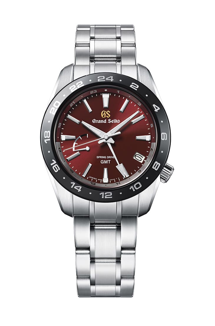 ▲9R Spring Drive 20週年,GS發表暗紅色面盤搭配黑色陶瓷圈的兩地時間手錶SBGE305。