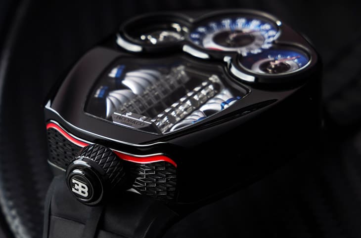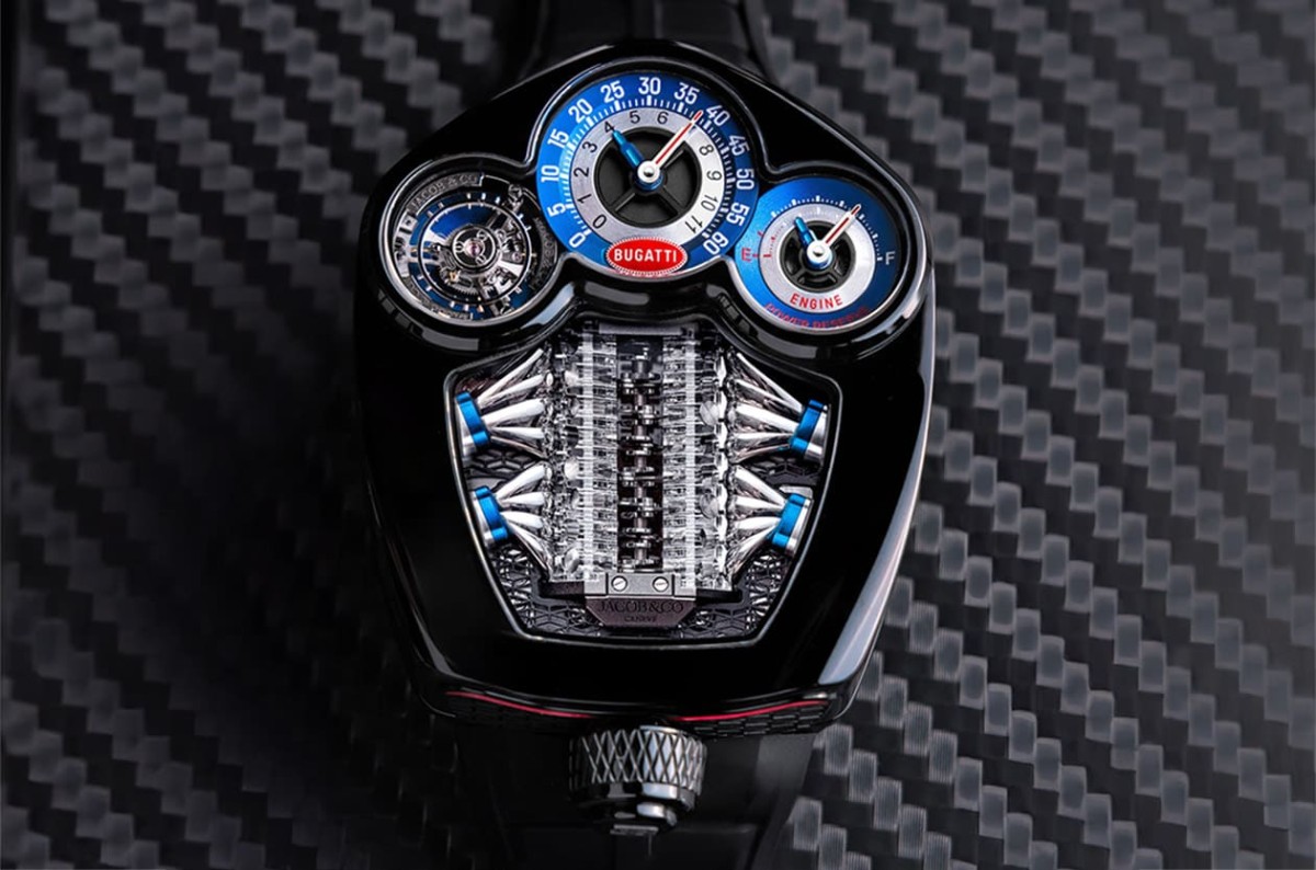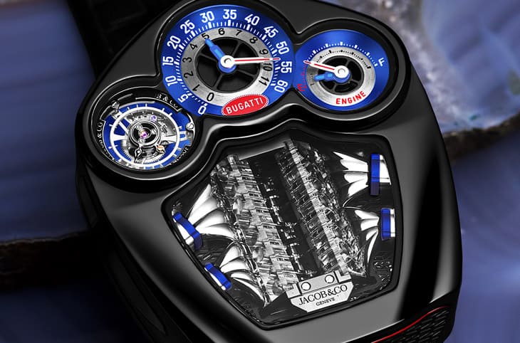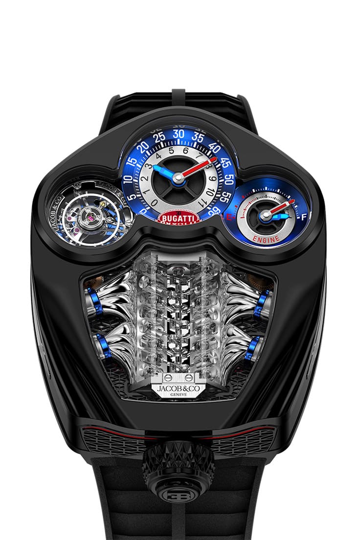 造型獨特的錶殼做出三個進氣口造型的凹槽,其中錶殼下方位於錶冠兩側部分加上了雷射蝕刻的網格圖案,用以模擬車頭的水箱護罩,另外錶側分別開有兩扇觀賞用、鑲有藍寶石水晶鏡面的視窗,讓人聯想起超跑的車窗。JACOB & Co.並替搭配上黑色橡膠立體壓紋錶帶,提供手錶靈活、舒適的佩戴感受,並且能延續整體的全黑外觀美學。