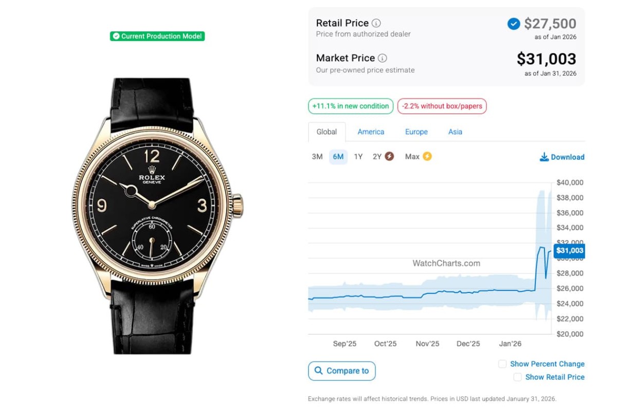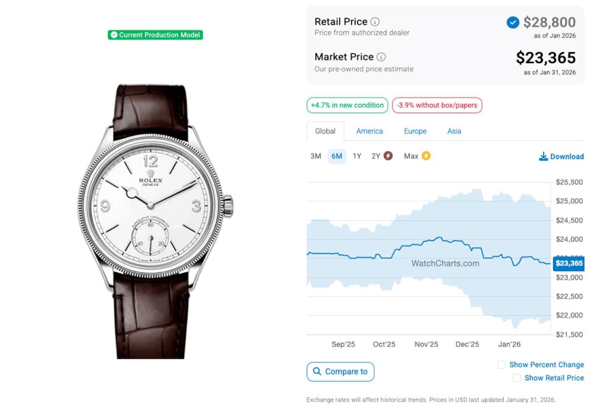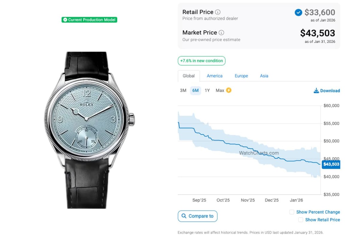同樣從WatchCharts公佈的數據可知,目前三款1908系列作品中,白金款52509過去半年來二級市場價格變化不大,最近一個月呈現平穩中略往下降的趨勢,如今身價為23,365美金(約合台幣74萬);黃金款52508倒是有很戲劇化的發展,它在跨入2026年後一度維持與2025年底差不多的身價,大概在25,000美金左右,然而進入2026年1月下旬,手錶在短短十天左右就爆發性成長衝破3萬美金關卡,過程中一度回到至27,000美金,但很快又衝破3萬大關,目前的二級市場報價來到31,003美金(約合台幣98萬2),這已經是過去一年來價格的最高點了。鉑金款52506在2025年前八個月身價都在55,000美金上下微幅波動,但從那以後就每況愈下、逐月有感下滑,跨年後跌勢依舊不止,現在跌到剩43,503美金(約合台幣137萬7)左右,看來市場對於鉑金款的喜愛程度雖然最高,但能接受溢價的程度也隨著時間拉長和貨量增多而減弱。