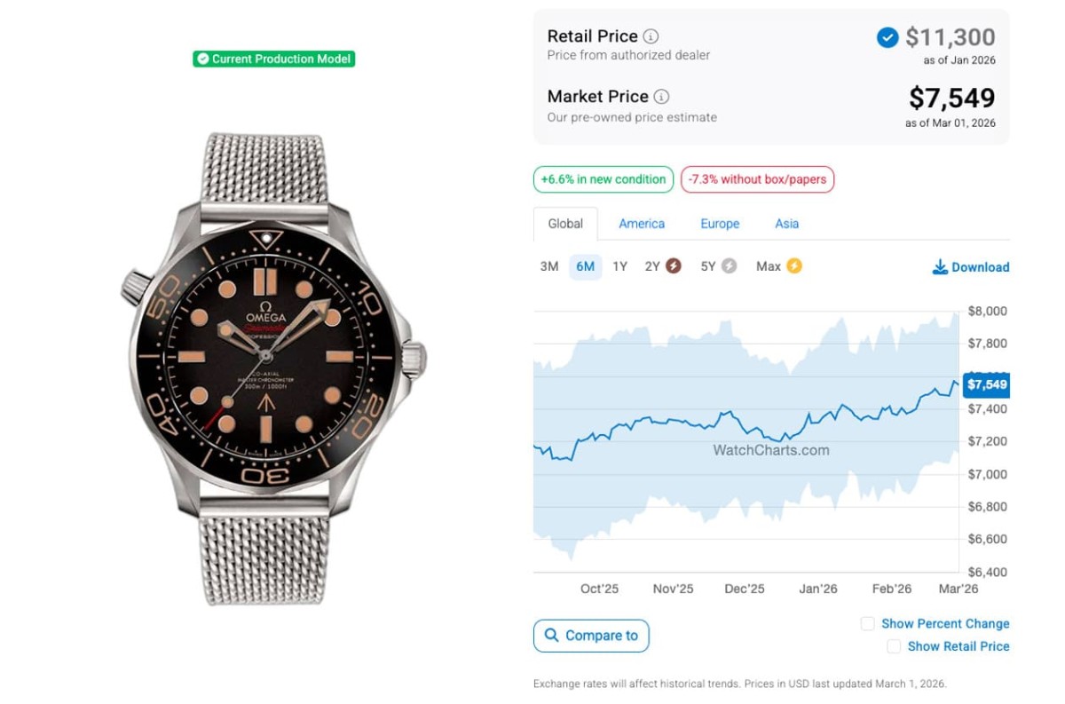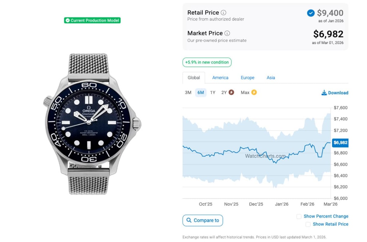 而在經過半年之後的現在,同樣從WatchCharts觀察的數據可知,兩款錶經過這段時間以來的發展,行情又出現了一點變化,210.90.42.20.01.001(007限定款)這期間價格大致在往上走,國外報價在7,100美金朝7,500美金逐漸成長,進入到2025年7和8月各短暫衝到該年新高,9月價格一度走下坡到10月後則又出現上揚局勢,在跨年前後曾經歷一波開低走高的走勢,2月以來則再衝高一波,最新的二級市場報價為7,549美金(約合台幣23萬7)。而210.30.42.20.03.002(龐德電影60週年紀念款)本來是有點每況愈下,它的超定價行情持續到2024年5月中以後正式告終,在那之後連續兩年多國外報價都是呈往下跌的走勢,2025年6月整月雖開低走高,到7月以後到現在又連續震盪,這樣「跌跌不休」的情況到2025年底都是,跨了年後才有稍微回升一點點,而在2~3月間呈現"V"形走勢,如今身價回溫至6,982美金(約合台幣22萬)的短期高點,不過這數字已經比007限定款更低價了,行情仍處於出道以來的低點,加上歐米茄在2024年底又接連推出同樣配置米蘭鍊帶的海馬潛水300米,使得龐德電影60週年紀念款過往的那種特別感被稀釋,二級市場行情與007限定款逐漸拉近甚至反轉。