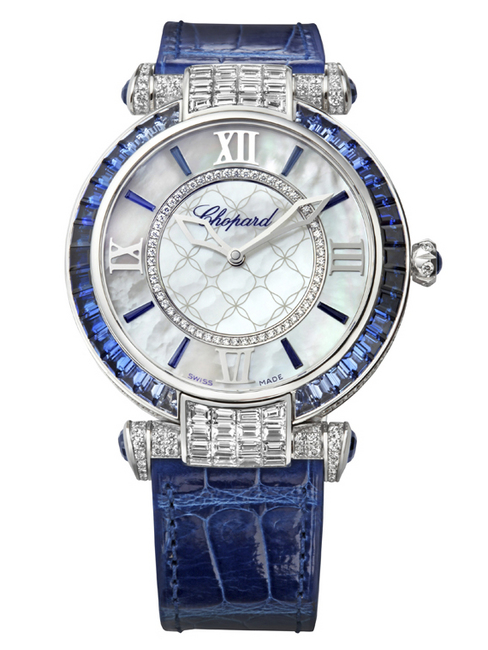 18K玫瑰金或白金錶殼錶錶圈鑲嵌粉色或藍色彩色剛玉,珍珠母貝錶盤妝點上同色剛玉的時間刻度,璀璨的鑽石環繞成圈與鋪陳在錶耳的鑽石互相輝映;搭配與錶圈相同顏色的鱷魚皮錶帶,細節精緻細膩而豐富多變,賦予Imperiale Joaillerie系列手錶華麗優雅的女性魅力,經典雋永的造型重現皇家古典主義的貴族精神和宏偉風範。只有在蕭邦專賣店展售。
