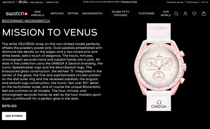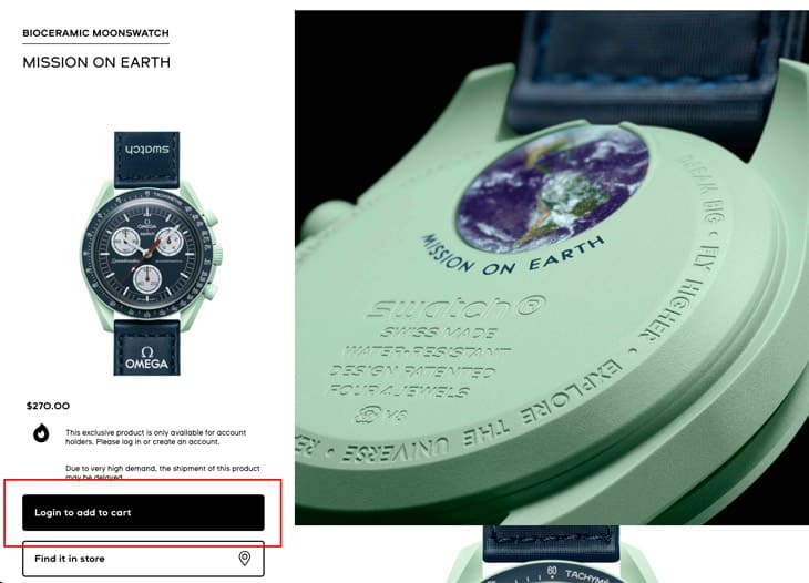 ▲相較之下不在名單中的MoonSwatch金星款,它的頁面還是和原本一樣,並沒有加入購物車按鈕。