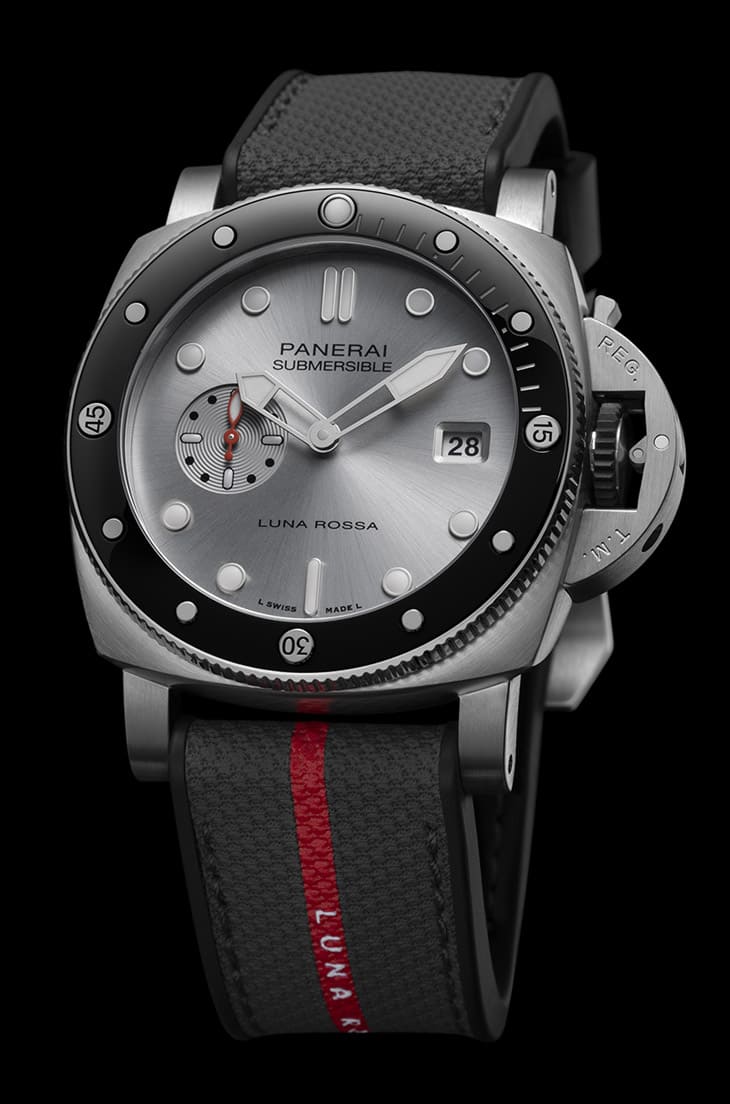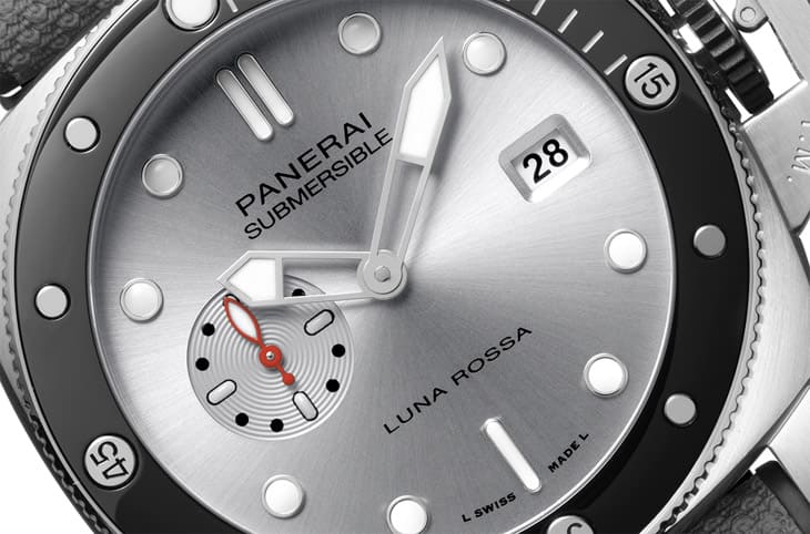 面盤與錶帶顏色也有一點呼應的意思,其呈現出的銀色太陽紋會有深淺色澤的變化,這種反射光芒的效果和帆船船體有點接近,同時沛納海也不忘運用象徵Luna Rossa Prada Pirelli帆船隊的白色、紅色、灰色和深藍色等,作為點綴面盤的細節之用。這款錶9點方向的小秒盤出現了品牌手錶過往較少採用的設計,以Azurage雕紋修飾小錶盤,因此它的盤面上的同心圓紋立體感強烈,甚至還會向漩渦般讓人有波浪一層一層往外開展的感覺。