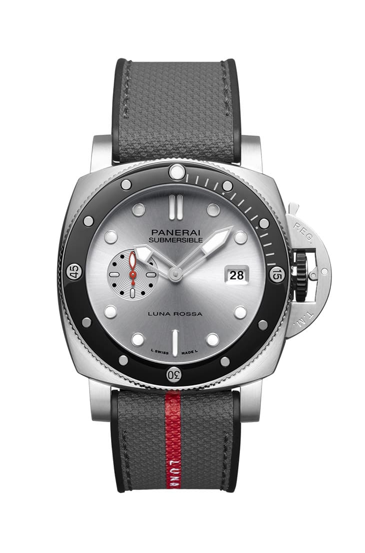 PANERAI沛納海持續為了參加第37屆美洲盃帆船賽的贊助合作對象——Luna Rossa Prada Pirelli帆船隊加油助威,品牌推出新款再度融匯兩大元素,一是Submersible潛水錶系列,二則是從帆船隊擷取的相關設計靈感,交織出Submersible QuarantaQuattro Luna Rossa PAM01681這款作品。
