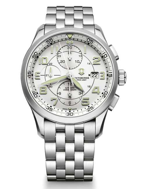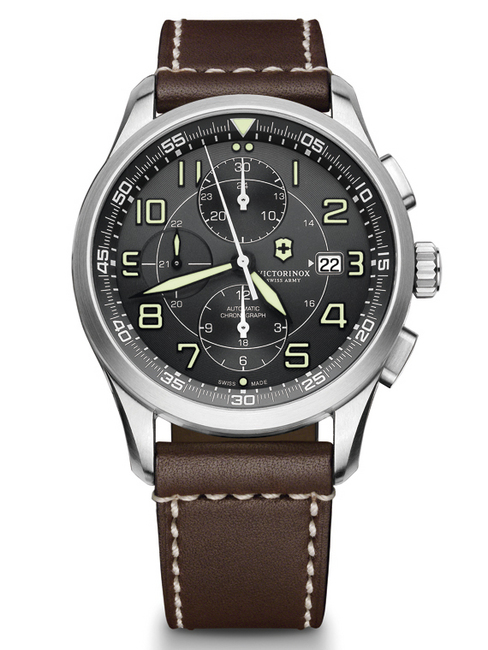 這款經改良的新款設計,所有功能均符合簡單美學、堅固、準確及清晰易讀的指導標準。寬闊的炭灰色或銀白色的錶盤,配備特大數字、夜光時分針,以及計時秒針,而Victorinox Swiss Army必備的軍用時間則於中央內圈顯示。