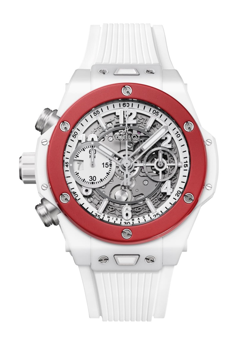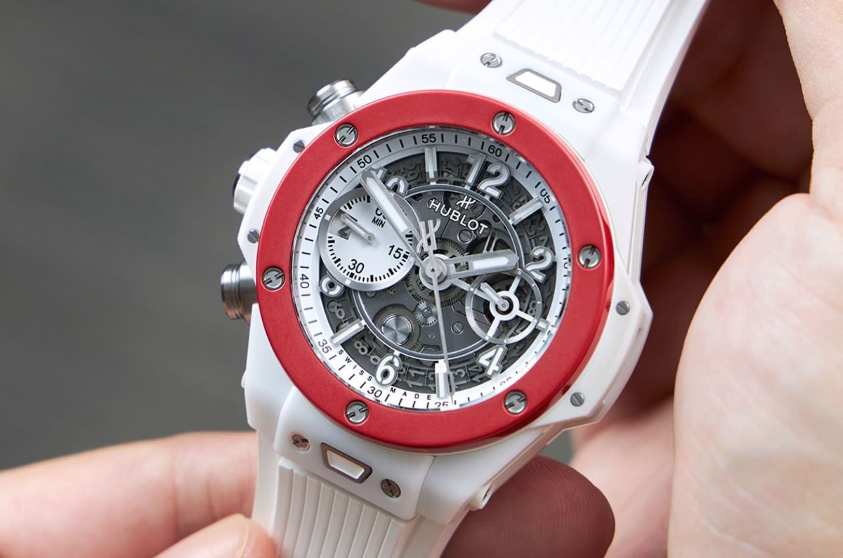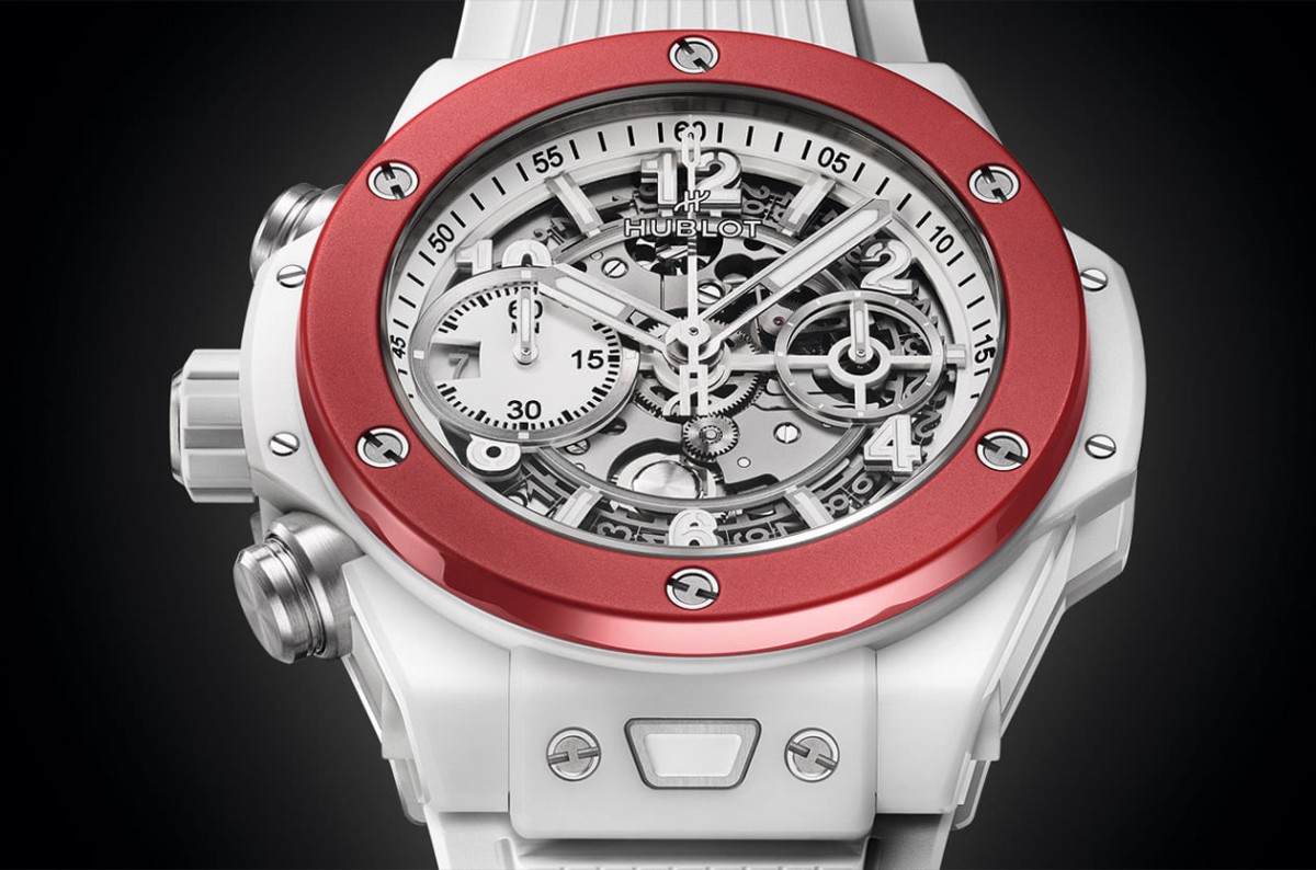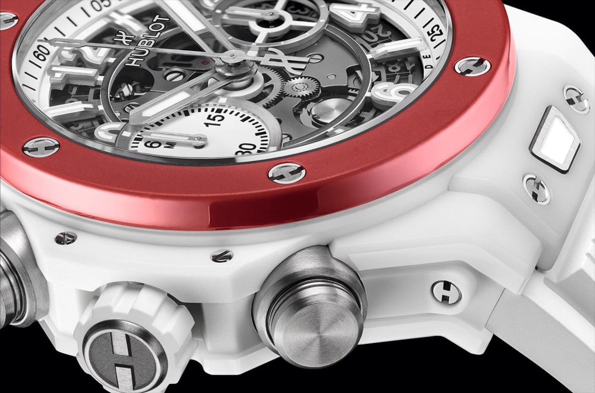 宇舶推出過為數豐富的陶瓷手錶,品牌調配出的陶瓷顏色亦冠絕錶壇,其所創作的各款陶瓷手錶往往視設計需要採用不同的打磨修飾,甚至有時候還會將陶瓷與金屬、碳纖維等融合形成異材質組合,然而Big Bang Unico左冠陶瓷計時碼錶令人格外驚豔的是,品牌罕見嘗試用白色陶瓷錶殼搭配紅色陶瓷錶圈,形成品牌首見的白紅雙色陶瓷組合。紅色的錶圈在白色錶殼上顯得十分奪目,細看錶圈表面與錶殼同樣以霧面處理,而在錶圈側面品牌用改用拋光修飾,如此一來可以增添手錶豐富視覺層次感。紅色陶瓷在拋光後反射出的光澤感令人心醉,針對同一處零件進行如此講究的繁複工藝修飾,放眼錶壇尚只有宇舶能如此應用自如地呈現陶瓷材質的精妙。