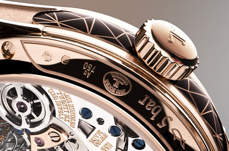 18K玫瑰金材質/184手動上鍊機芯/偏心時、偏心分、日期、星期、月份、四位數年份顯示/三問功能/球體陀飛輪裝置/萬年曆功能/黑色大明火琺瑯面盤/藍寶石水晶鏡面、透明底蓋/防水50米/錶徑43mm/限量5只/參考價:NT$ 33,600,000