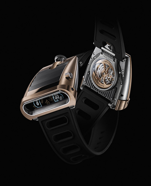 Jean-François Mojon、Vincent Boucard,以及他們在Chronode的團隊,共同研發了HM5的複雜引擎。儘管看起來似乎很簡單,但實際上卻相當複雜!跳時機構為雙向設計,允許時間能方便地前後調校。時、分盤由兩個礦石玻璃製成,並由一枚寬平的錶橋所支撐;兩個轉盤盡可能重疊,以便將半徑最大化,同時為易讀的大時標製造空間。將HM5 RT翻過來便能看到它的引擎,透過嵌於防水內層錶殼上的藍寶石水晶鏡面,能欣賞它22K金的戰斧形「神祕」自動盤、高速運轉的擒縱裝置,以及精細地令人驚訝的手工打磨橋板。