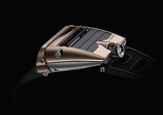 HM5出色的楔型錶殼,無疑是對大膽的Amida Digitrend致意。然而,它也同時從那個時代的低底盤超跑上獲得設計靈感。