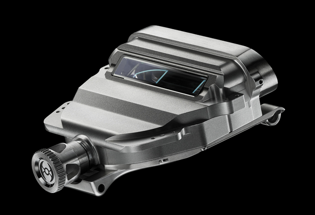 平面的時、分盤在機芯最上層轉動,然而我們看到的時間顯示卻是垂直呈現在錶盤的「儀表板」上。為了達到這個效果,MB&F與一家高精密光學玻璃供應商合作研發出一枚藍寶石水晶反射稜鏡,能將時、分盤所散發出的光線「折曲」90度,同時將尺寸放大20%以追求易讀性的極大值。