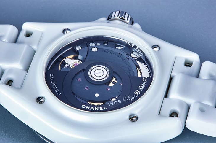 Mademoiselle J12 La Pausa限定腕錶面盤上的香奈兒女士人像創作靈感來自品牌創辦人拍攝於法國蔚藍海岸的 La Pausa自家別墅花園的照片,當天香奈兒女士身穿布列塔尼針織衫和鈕扣褲裝,頭戴海軍帽,顯得既休閒又率性,此人像的雙手設計為活動式,能夠繞著面盤轉動,也因此錶款沒有傳統的時、分指針,而將逸趣橫生的人像雙手直接當成顯時的依據。如此特殊設計的核心源自錶款內部的Caliber 12.1自動機芯,它是近年J12系列的基礎機芯,由香奈兒持有股份的瑞士知名機芯廠KENISSI戮力打造,品質和口碑都有亮眼表現。