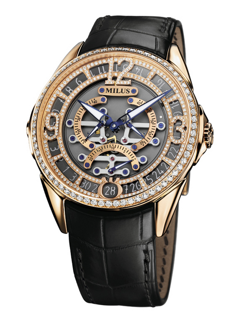 2006年,MILUS美利時突破多重技術挑戰,成功獨創精妙的TriRetrograde三秒針返跳功能,震撼錶壇。MILUS美利時的錶匠把一分鐘分成三個二十秒的等份,以三根返跳秒針別出心裁地顯示時間流逝的美態。在這兩款Tirion TriRetrograde三秒針返跳珠寶手錶上,三根返跳秒針在鏤空的錶盤上不斷交替運行,如舞者翩翩起舞,令人目眩神迷。手錶的時標框架同樣採用鏤空設計,露出置於其下的旋轉日曆圏,更巧妙地運用了位於六時位置的MILUS美利時標誌構成日曆視窗,饒富創意。當中,TIRI303採用直徑47毫米的白金錶殼,鑲嵌70顆約重1.55克拉的白色鑽石;鏤空時標框架上則鑲有261顆美鑽,共重約0.75克拉。TIRI410則擁有直徑45毫米的18K 5N紅金錶殼,錶殼及鏤空時標框架分別精心鑲嵌68顆(約1.34克拉)及249顆(約0.70克拉)白色鑽石。