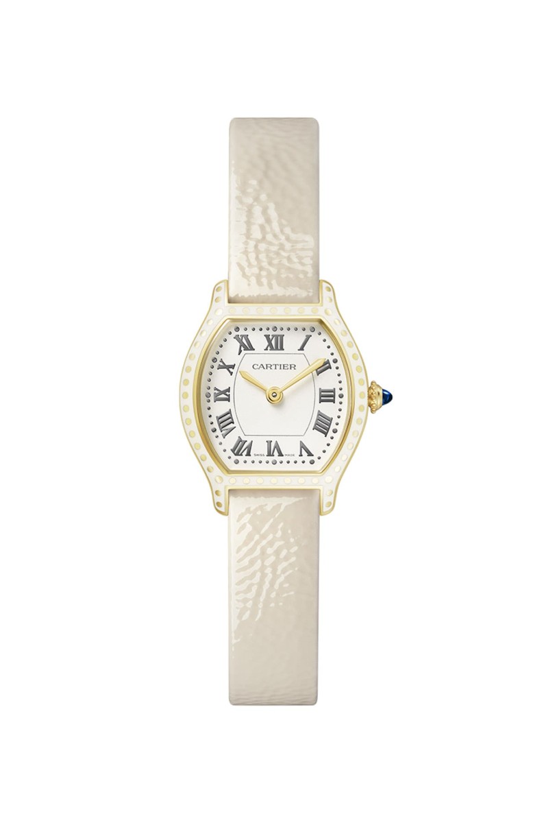 卡地亞另一款也是在1912年誕生的Tortue系列,因為錶殼兩側的弧線勾勒出類似龜殼的造型而廣為人知,2024年開發Tortue迷你款式,設計靈感受到1922年一款Tortue腕錶影響,因此在黃金錶殼上加入白色真漆點綴,如此一來錶殼的黃金在白漆覆蓋下呈現出許多點狀造型,白色珠光面盤外圍不循系列傳統採用軌道式刻度,而改用更密致的點狀刻度取代,其每5分鐘的刻度相對較大,營造出井然的視覺層次,同時鍍金指針造型則將1920年代錶款的設計悄悄植入,賦予腕錶熟悉中額外附加的新意。Tortue迷你款尺寸為26.15x20.9mm,比起CARTIER 2024年於Privé系列復刻的手動上鍊款式小了兩號,搭配亮面處理的米色紋理小牛皮錶帶,腕錶氣質頓時更臻婉約柔美。