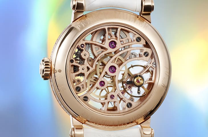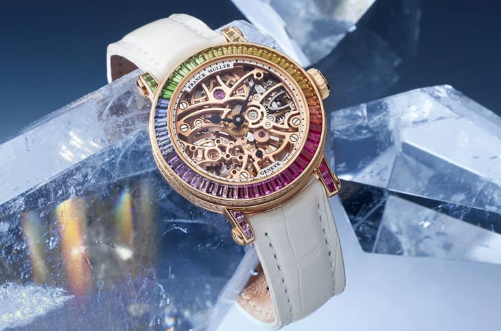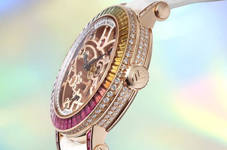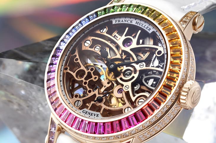 31mm的Round Skeleton Baguette在整體造型延續先前較大尺寸的設計之餘,FRANCK MULLER分別運用白金或玫瑰金材質以及寶石或鑽石等鑲嵌元素衍生出豐富的作品陣容,例如有的款式錶圈、錶耳鑲上紅寶石、有的改鑲藍寶石或錶殼全部都鑲鑽石等等;在各式Round Skeleton Baguette新作中,FRANCK MULLER於亞太區獨家發行的一款"Rainbow"款式吸睛程度堪稱數一數二,一看到這個名詞很快就能意識到它的錶圈寶石想必更加繽紛耀眼,比起一般鑲嵌雙色寶石或單色鑽石的設計,視覺驚豔度明顯更上層樓。