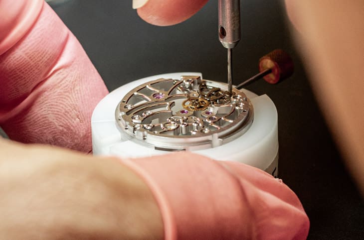 ▲經過鏤空處理的機芯零件分別經過進一步打磨修飾,機芯結構光澤感的反差襯托出它的立體感,在製作組裝階段難度比一般機芯更高。